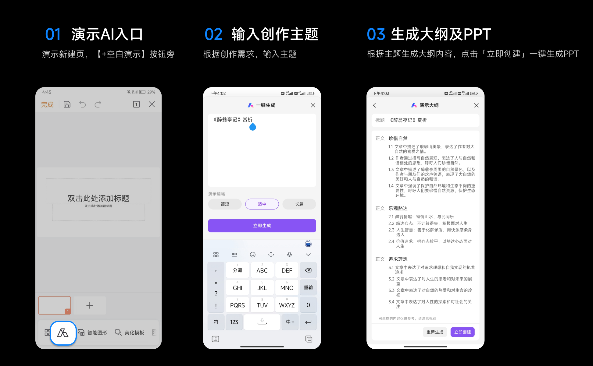 一键生成PPT:根据创作需求,输入你的主题,如:「《醉翁亭记》赏析」,调整演示篇幅。